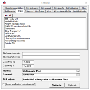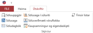- Sölugreining og skýrslur: Notandi getur skrifað út söluuppgjör, söludagbók eða sölugreiningu sem hægt er að greina til dæmis eftir sölumönnum, vöruflokkum, vörunúmerum, viðskiptamannaflokkum, greiðsluskilmálum, afhendingarskilmálum og fleiri atriðum. Skýrslur er hægt að fá beint í PDF eða yfir í excel töflur til frekari greiningar.