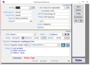 - Staða tímabókunar: Hver og ein bókun getur haft eins margar stöðu og notandi óskar eftir. Dæmi: a) Bókað, b) Klárt til vinnslu c) Verk í vinnslu, d) Verki lokið, e) Beðið eftir varahlutum eða hvaða stöðu sem notendum dettur í hug að skilgreina.